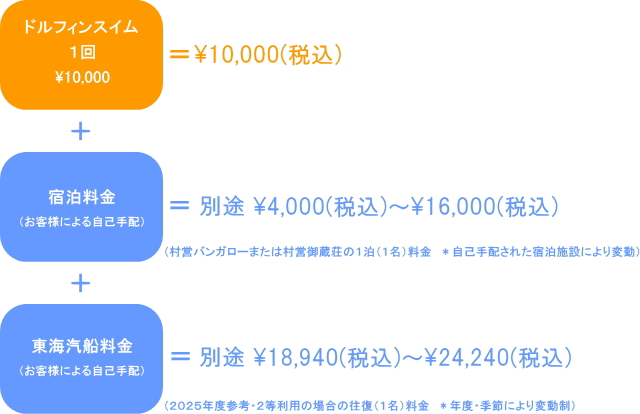 ・当店開催ドルフィンスイムツアーは、「村営御蔵荘」または「村営バンガロー」にご宿泊のお客様がご参加の対象となります。(その他の宿へご宿泊のお客様は、その他ドルフィンスイムボートへお問合せ下さい)